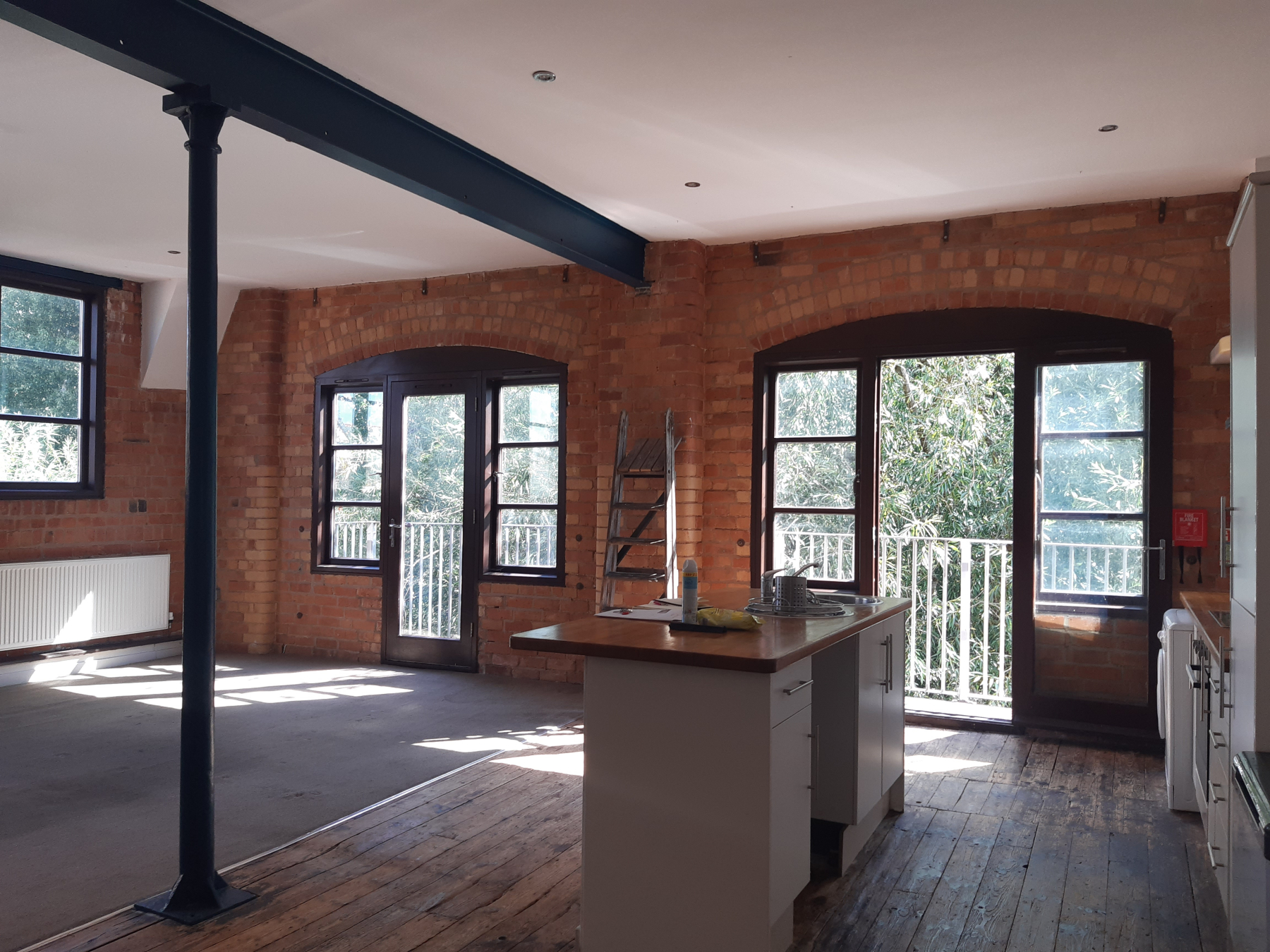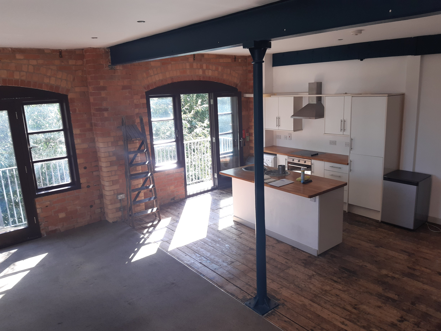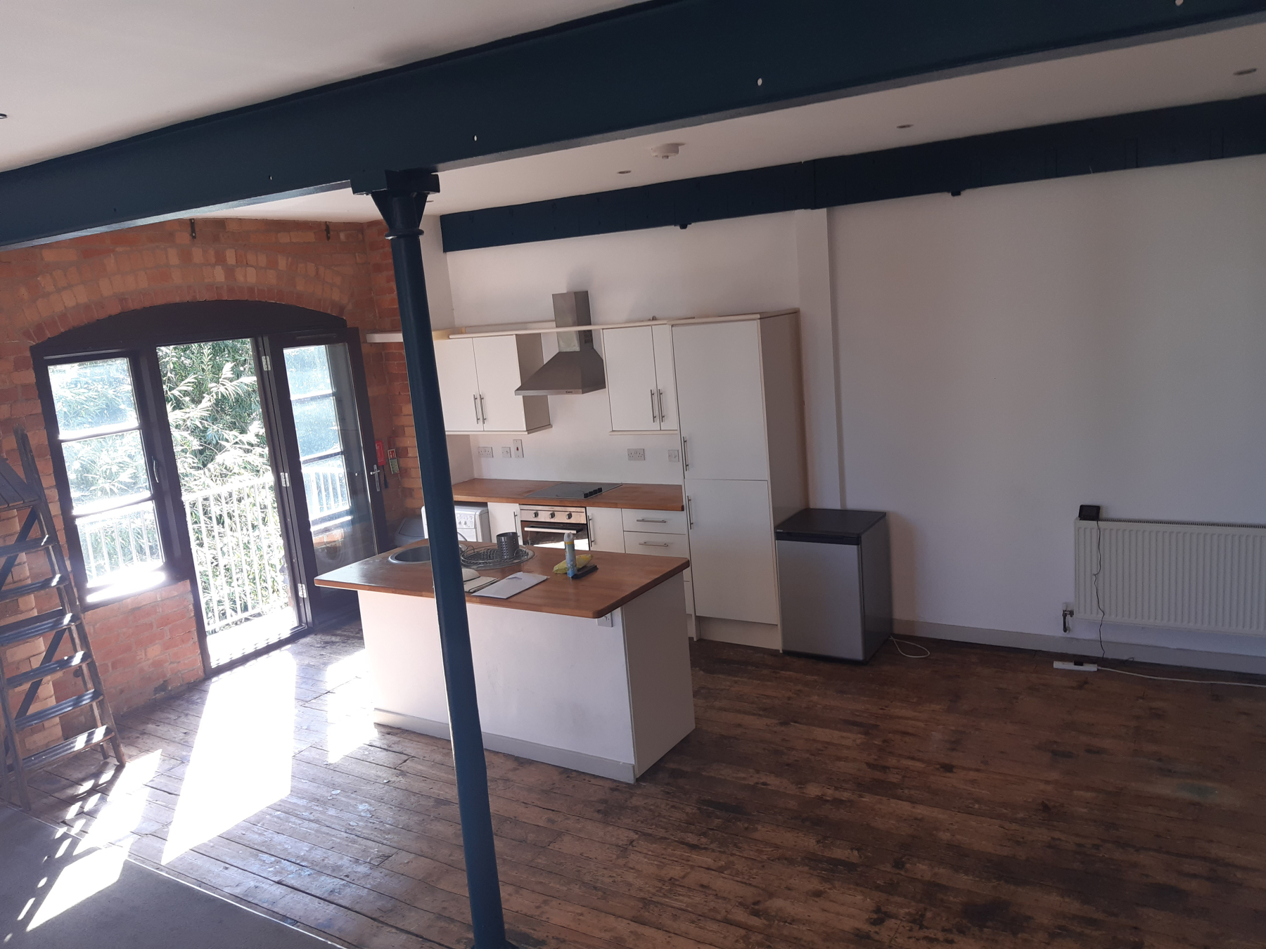 This apartment is located next to the River with double doors opening outside.