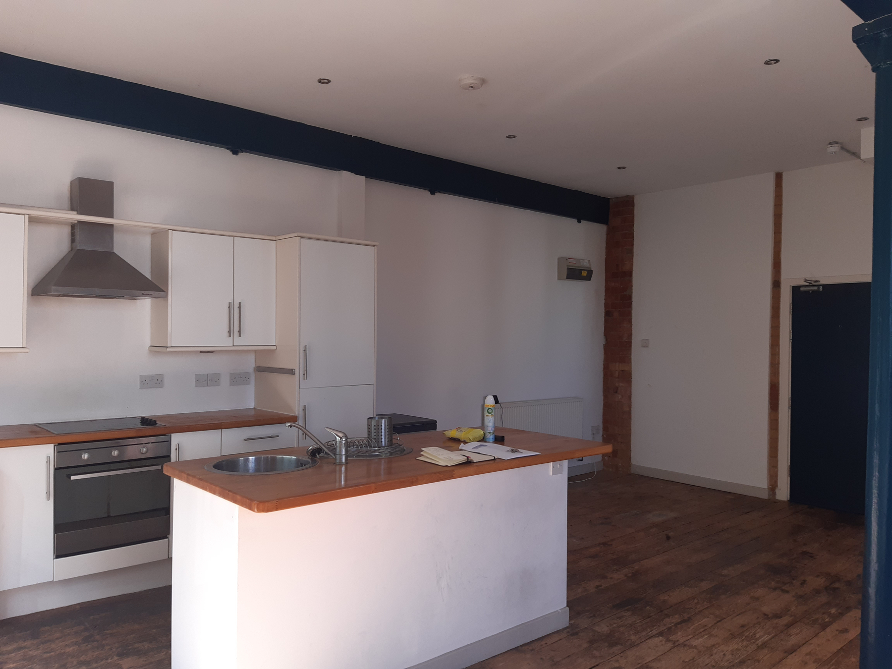 The kitchen is open plan with fitted oven and hob.