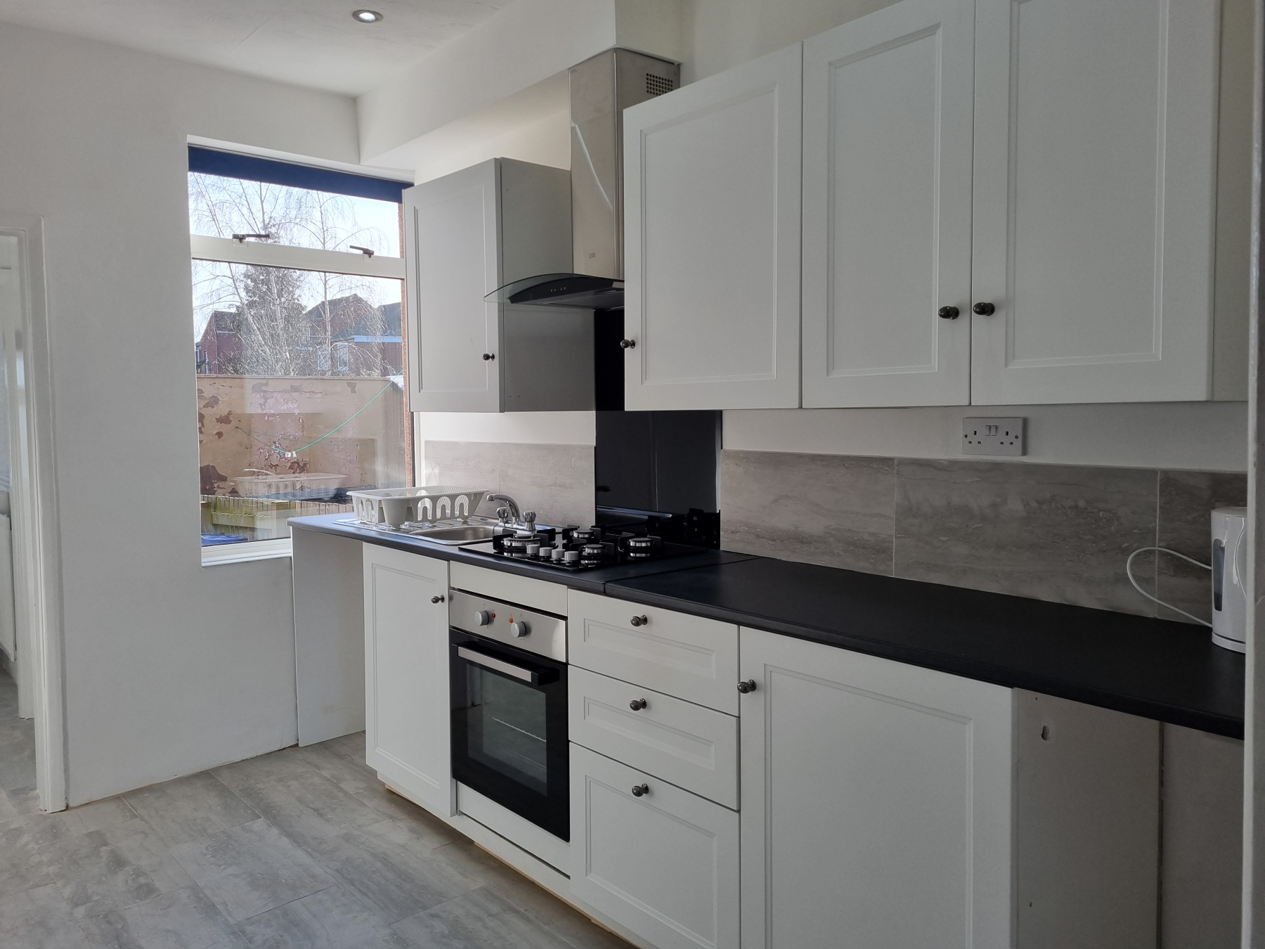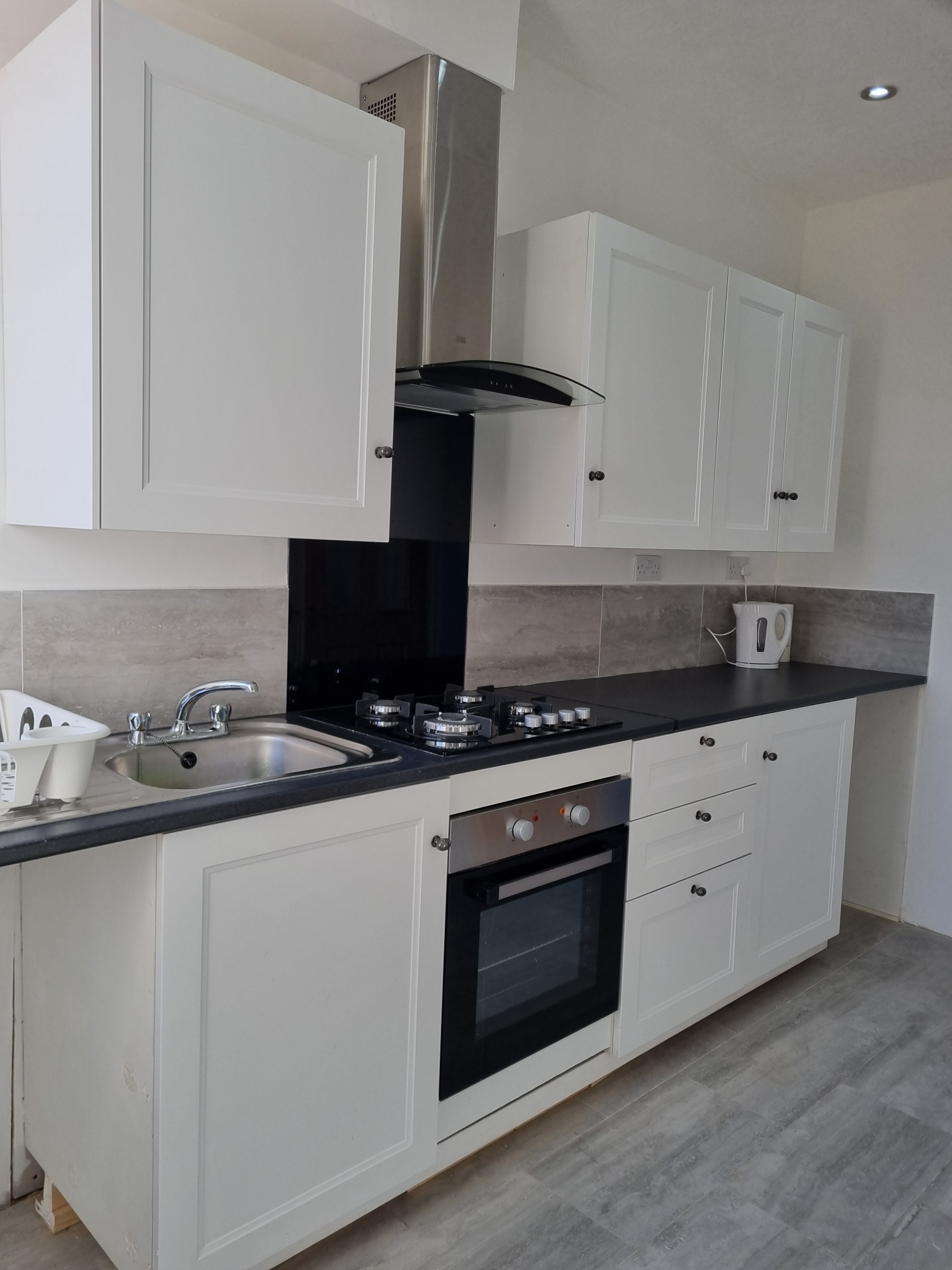 NEW FITTED KITCHEN WITH BUILT IN HOB, OVEN AND EXTRACTOR.