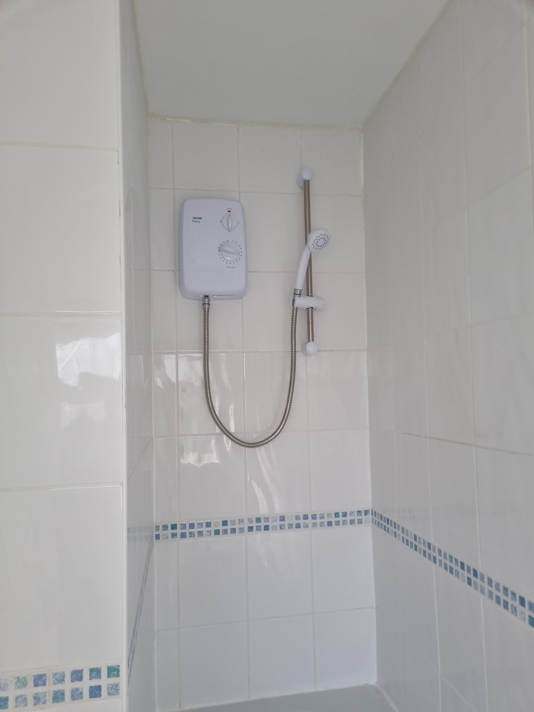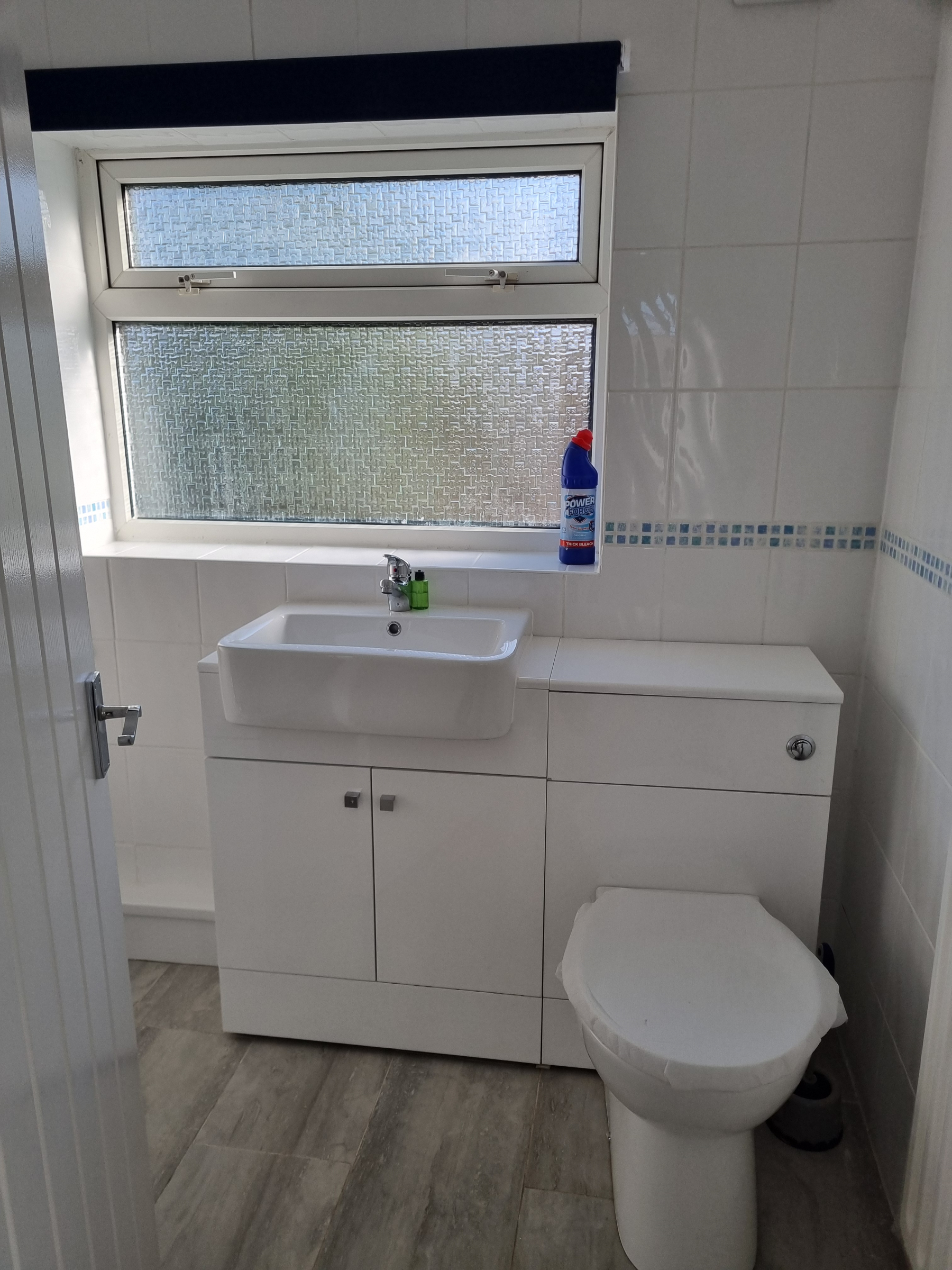 NEW BATHROOM WITH NEW WHITE SUITE COMPRISING PANELLED BATH WITH SHOWER OVER, WASH HAND BASIN AND LOW FLUSH WC.
