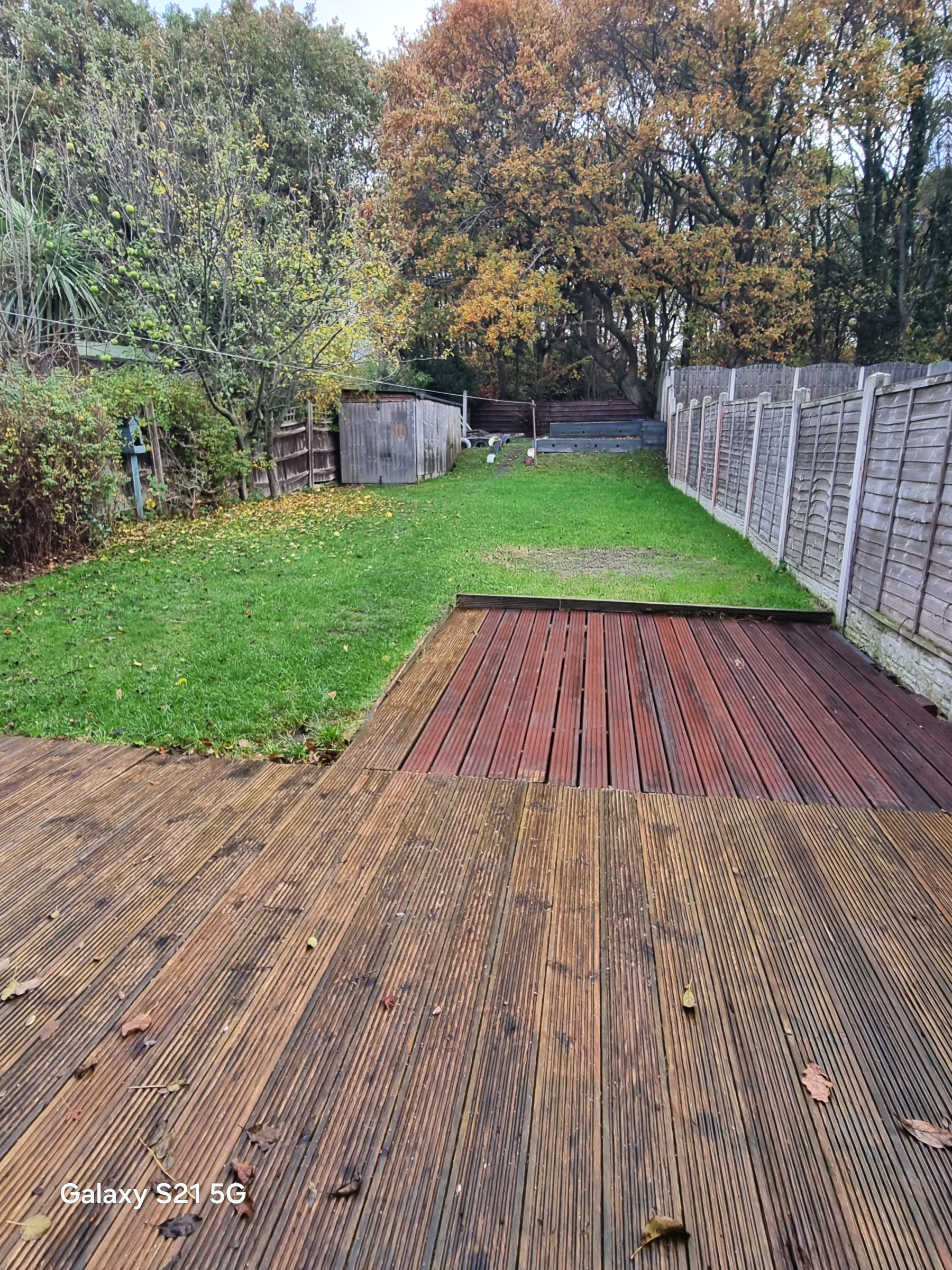 Extensive rear garden with lawn, shed and decking areas. There is an integrated Garage .